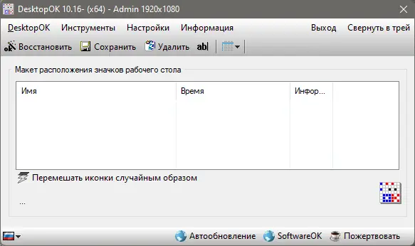 Использование DesktopOK предельно простое. После запуска приложения оно автоматически начинает отслеживать текущее состояние рабочего стола. Пользователь может вручную создать снимок позиций иконок, выбрав опцию сохранения в меню. При изменении разрешения экрана или подключении проектора достаточно загрузить соответствующий профиль, чтобы иконки вернулись на свои места. Дополнительные функции, такие как скрытие значков или сворачивание окон, доступны через контекстное меню или горячие клавиши.