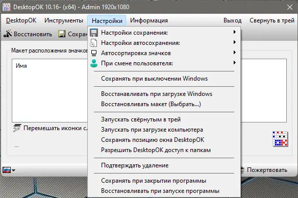 - Автоматическое сохранение текущего расположения иконок с возможностью быстрого восстановления.