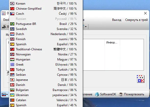 Использование программы интуитивно понятно. После запуска DesktopOK отображается в системном лотке, откуда можно быстро вызвать основное меню. Для сохранения текущего расположения иконок достаточно выбрать соответствующую команду. При изменении разрешения экрана или подключении внешнего монитора пользователь может восстановить нужный макет за пару кликов. Функция автосохранения позволяет не беспокоиться о случайной потере настроек. Также доступны инструменты для изменения размера иконок, скрытия всех значков или сворачивания активных окон. Интерфейс поддерживает смену языка, включая русский и другие локализации.