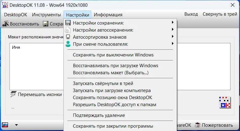 DesktopOK — это компактная утилита для сохранения и восстановления расположения иконок на рабочем столе Windows. Программа помогает избежать беспорядка при смене разрешения экрана, подключении проектора или использовании док-станций. Она работает без установки, поддерживает автоматическое сохранение и настройку под разных пользователей.