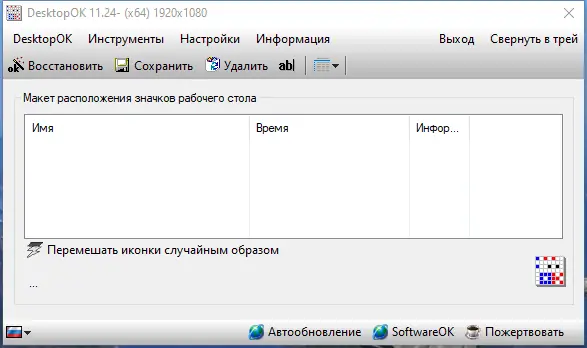 DesktopOK — это компактная портативная утилита, которая позволяет сохранять и восстанавливать расположение иконок на рабочем столе Windows. Программа особенно полезна при частой смене разрешения экрана, подключении внешних мониторов или использовании проекторов. Она автоматически фиксирует позиции значков, поддерживает несколько профилей и работает без установки, что делает её удобной для повседневного использования.
