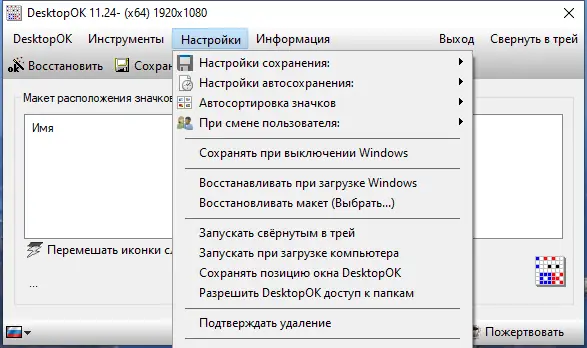 - Автоматическое сохранение позиций иконок при изменении разрешения экрана.