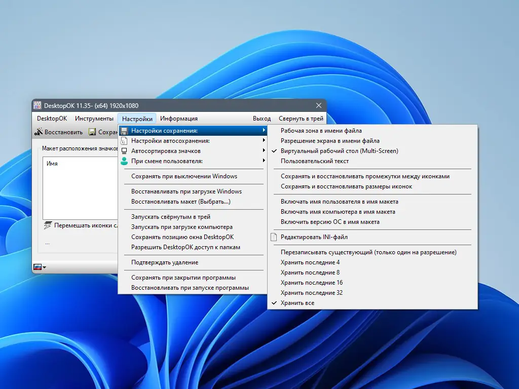 - Автоматическое сохранение позиций иконок при изменении разрешения экрана