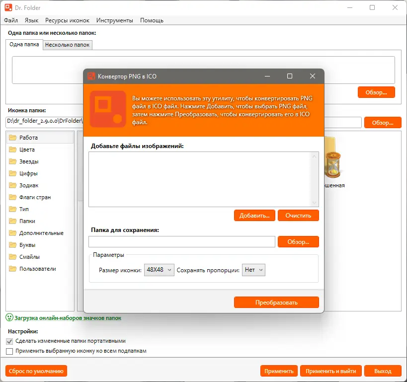 Dr. Folder — это удобное приложение для персонализации внешнего вида папок в операционной системе Windows. Программа позволяет быстро заменять стандартные значки каталогов на уникальные иконки, а также конвертировать изображения в формат ICO. Благодаря интуитивному интерфейсу и широким возможностям настройки, пользователи могут легко организовать файловую систему визуально, делая её более понятной и структурированной.