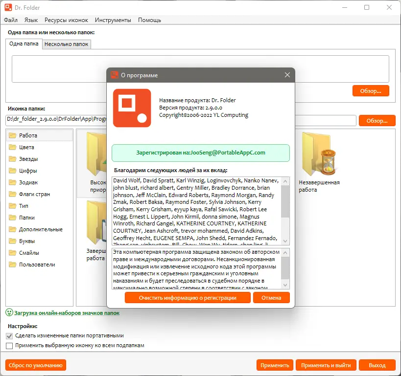 Использование Dr. Folder не требует специальных знаний. После установки программа автоматически добавляется в контекстное меню, и для изменения иконки достаточно щёлкнуть правой кнопкой мыши по нужной папке и выбрать соответствующий пункт. Откроется окно с выбором иконок, включая встроенные наборы и пользовательские коллекции. Можно загружать собственные изображения, которые программа самостоятельно преобразует в формат ICO. Поддерживается пакетная обработка — одновременно можно изменить значки для нескольких каталогов. Для восстановления стандартного вида предусмотрена функция сброса, доступная в том же меню. Настройки интерфейса позволяют адаптировать внешний вид программы под личные предпочтения, включая выбор темы и языка.