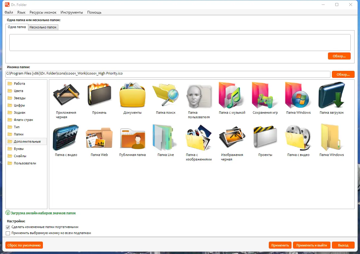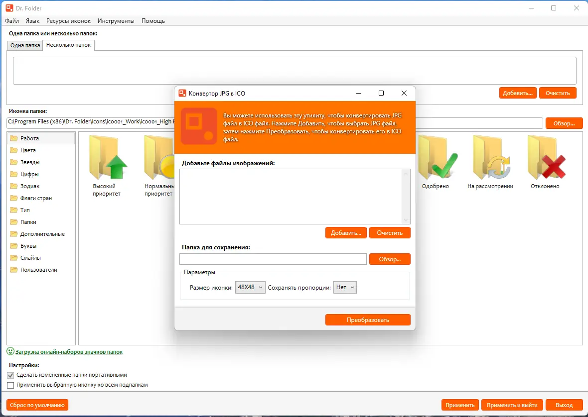 Dr. Folder — это удобное приложение для персонализации внешнего вида папок в операционной системе Windows, позволяющее быстро заменять стандартные иконки на уникальные и конвертировать изображения в формат ICO. Программа упрощает процесс настройки значков, который в обычных условиях требует ручного редактирования атрибутов папок и поиска подходящих файлов нужного формата. С её помощью пользователь может визуально структурировать файловую систему, делая каталоги более узнаваемыми и организованными.