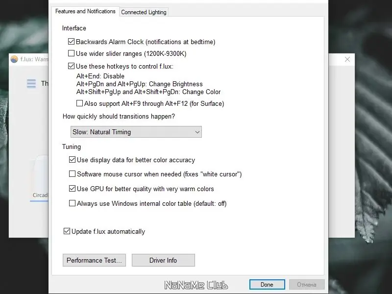 Программа f.lux помогает защитить зрение, автоматически регулируя цветовую температуру экрана в зависимости от времени суток. Она снижает нагрузку на глаза за счёт плавного перехода от холодных оттенков днём к тёплым — ночью.