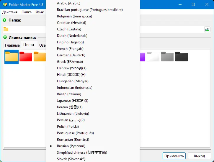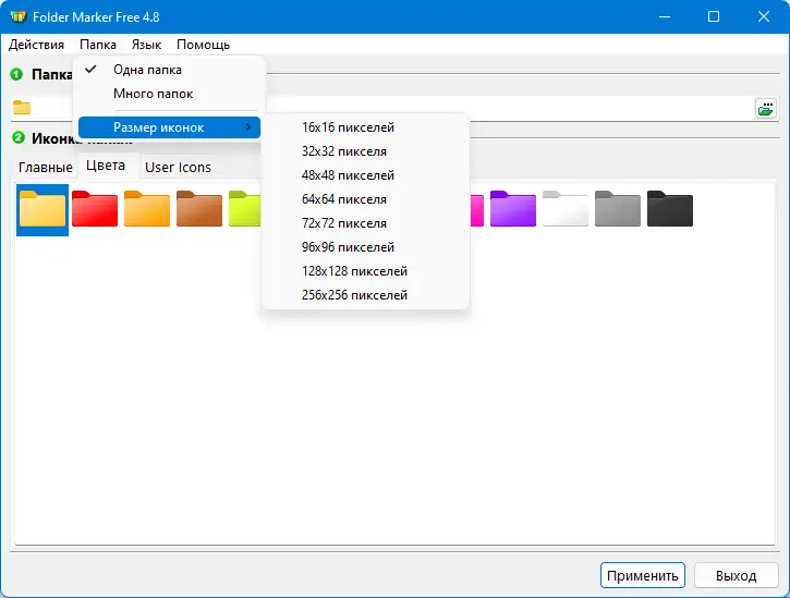 - Позволяет изменить значок папки за один клик через контекстное меню
