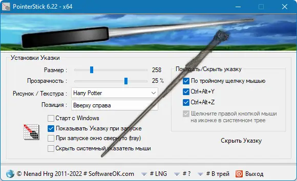 После запуска приложение начинает функционировать в фоне, автоматически изменяя внешний вид курсора. Управление осуществляется с помощью назначаемых комбинаций клавиш: одна из них включает или отключает указку, другая может использоваться для переключения между текстурами. Настройки можно менять в реальном времени, включая масштабирование и уровень альфа-канала, чтобы указка не перекрывала важные элементы. Интерфейс минималистичен, что упрощает освоение даже для новичков. Все изменения применяются мгновенно, а конфигурация сохраняется при выходе из программы.