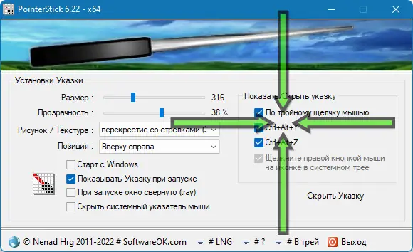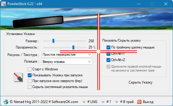 - Утилита заменяет стандартный курсор на крупную указку, легко различимую на любом фоне.