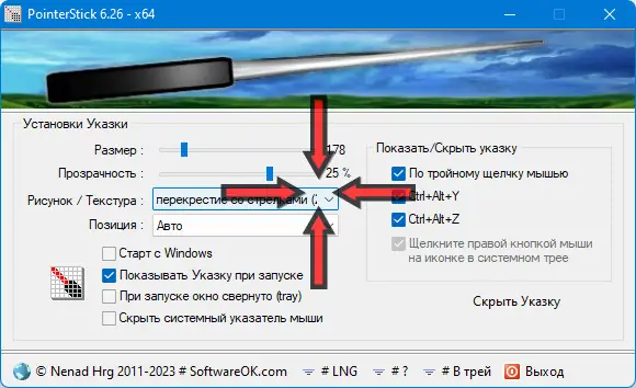 - Поддерживается регулировка размера указки в зависимости от разрешения экрана