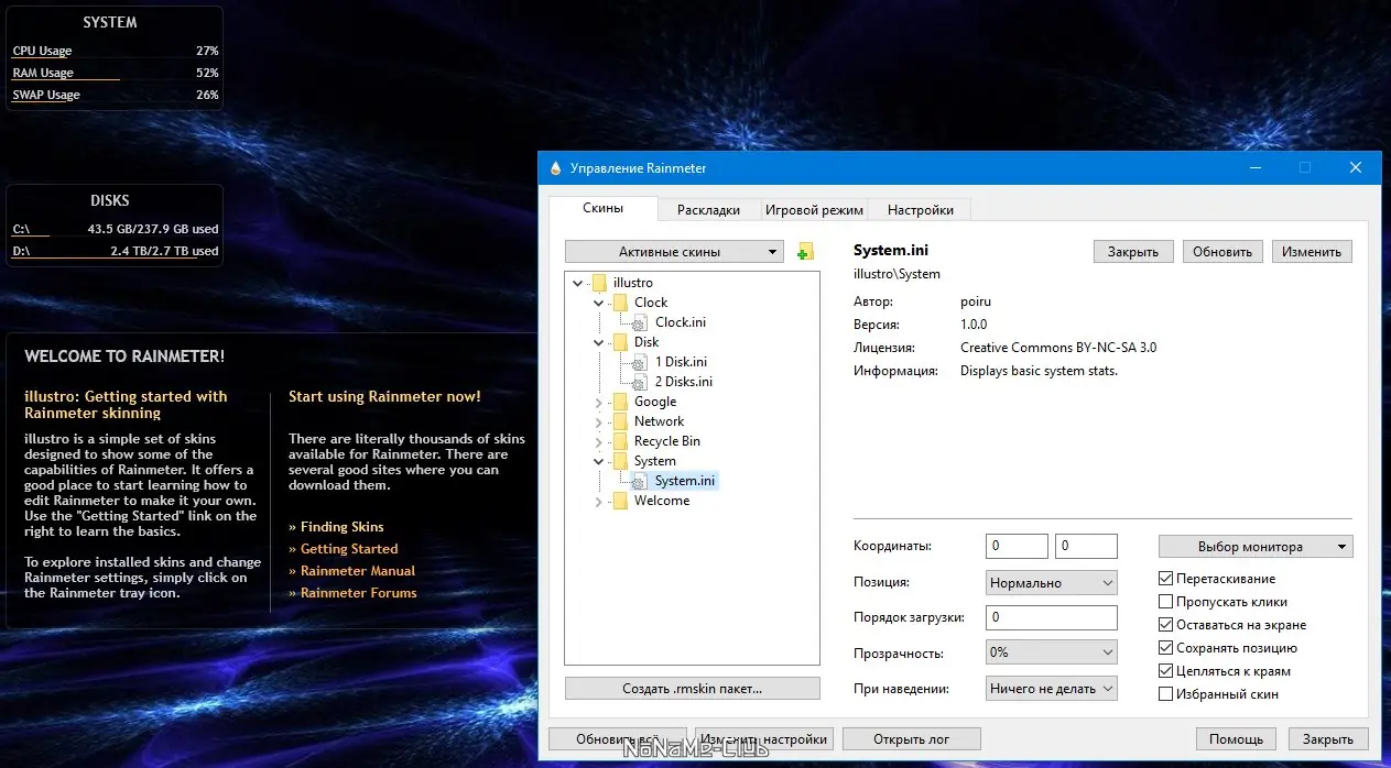 Rainmeter — это мощная утилита для отображения системной информации на рабочем столе в удобной и визуально привлекательной форме. Программа предназначена для пользователей, которым важно видеть состояние компьютера в реальном времени без необходимости запуска дополнительных приложений. Она позволяет отслеживать загрузку процессора, объём используемой оперативной и виртуальной памяти, состояние дискового пространства, сетевую активность, включая скорость передачи данных и IP-адрес. Кроме того, Rainmeter поддерживает интеграцию с внешними сервисами, такими как погодные данные и ленты новостей, что делает его не только функциональным, но и информационно насыщенным инструментом.