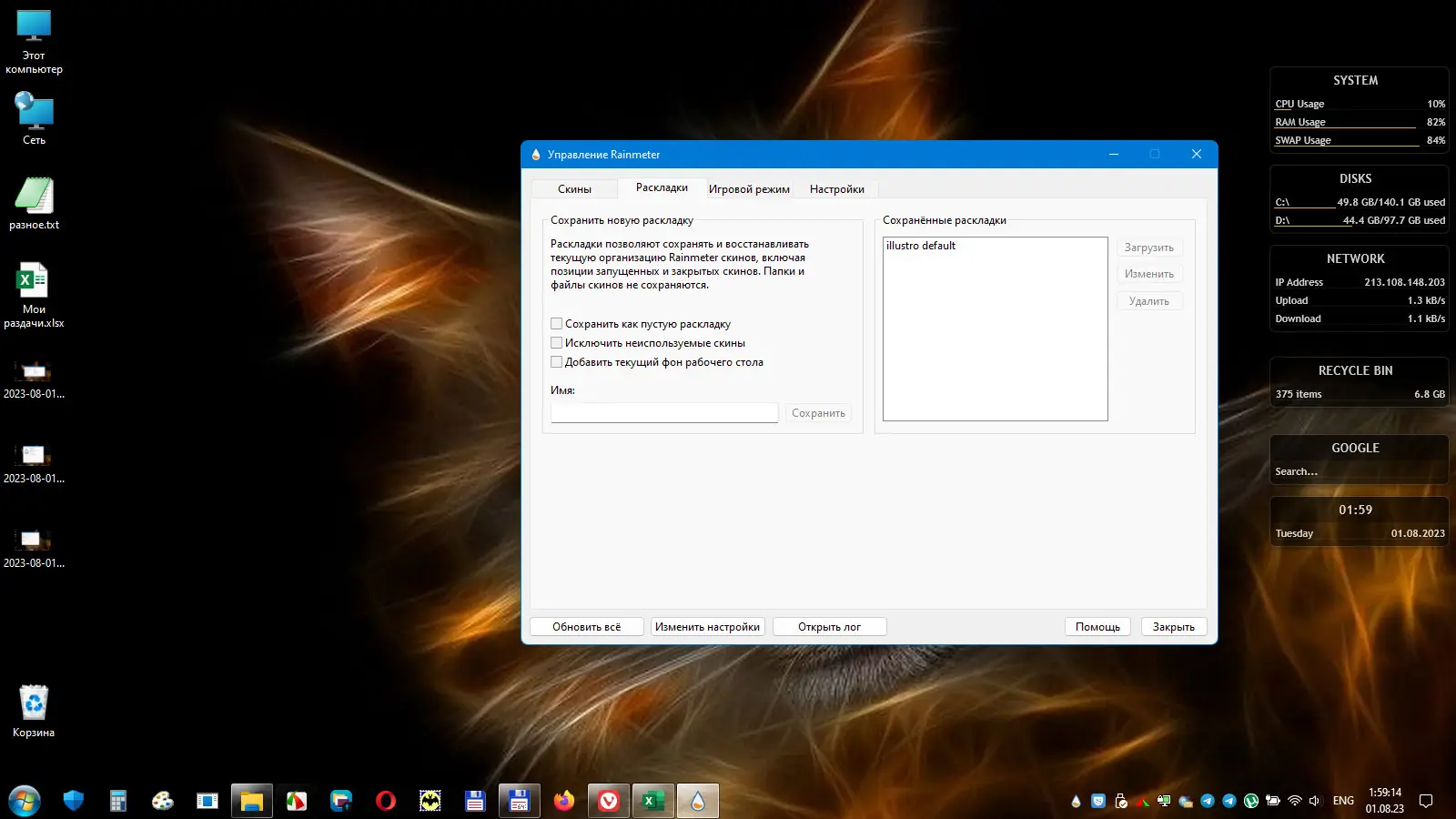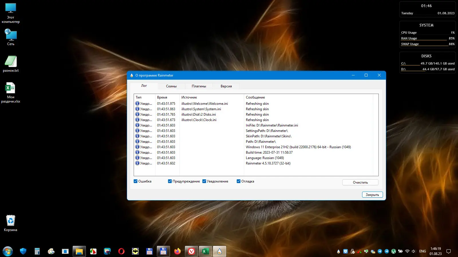Rainmeter — это мощная утилита для отображения системной информации на рабочем столе, позволяющая визуализировать загрузку процессора, использование оперативной и виртуальной памяти, состояние дискового пространства, сетевую активность, а также отображать данные о погоде и новостных лентах. Программа отличается гибкостью настройки и стилистическим разнообразием, позволяя каждому элементу органично вписываться в интерфейс Windows, создавая эффект живого, динамичного рабочего пространства.