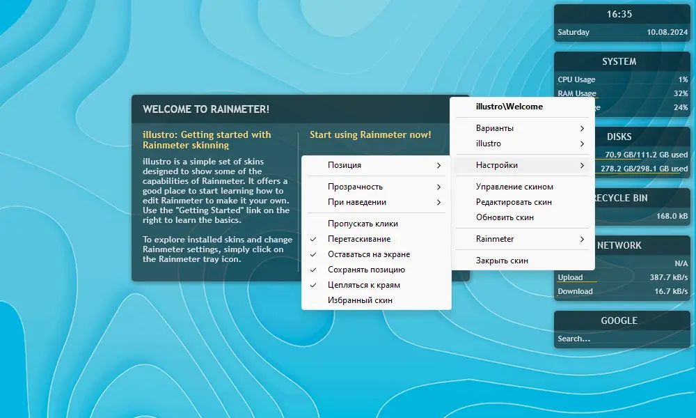 Rainmeter представляет собой мощный инструмент для визуализации системной информации и кастомизации внешнего вида рабочего стола. Приложение работает на основе скинов — специальных модулей, отвечающих за отображение данных и их оформление. Каждый скин может представлять собой часы, термометр загрузки процессора, календарь или виджет с информацией о погоде. Благодаря гибкой архитектуре, пользователи могут не только использовать уже готовые решения, но и создавать собственные модули. Программа не требует значительных ресурсов и работает стабильно на большинстве конфигураций.