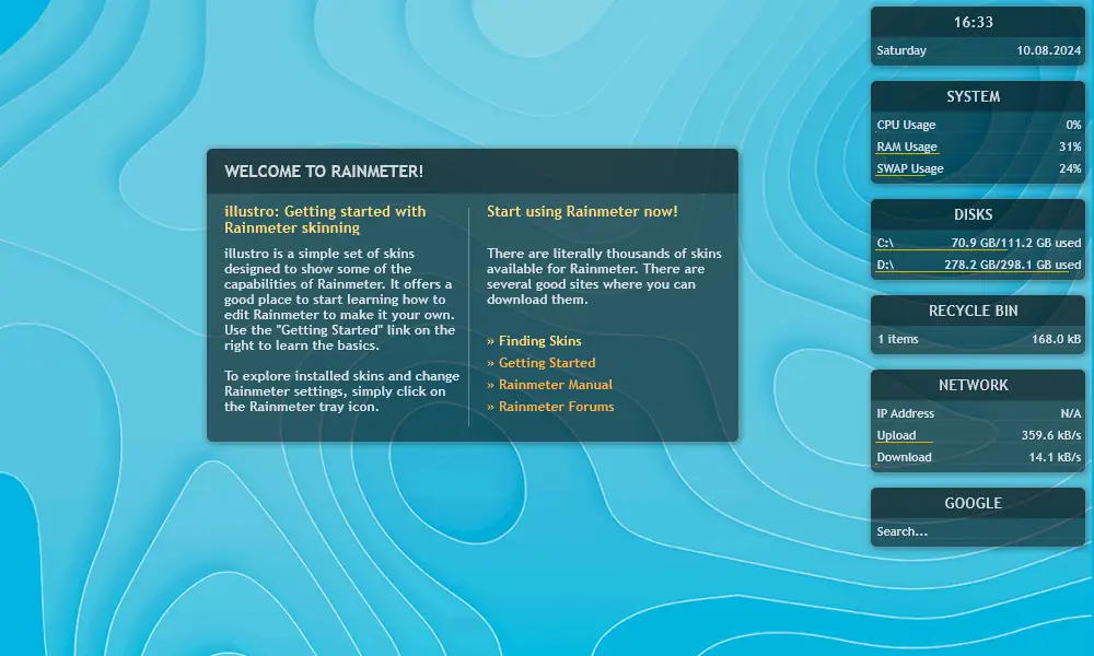 После установки Rainmeter на рабочем столе появляются стандартные элементы, такие как часы или индикатор загрузки ЦП. Пользователь может добавлять новые модули через контекстное меню программы, выбирая из предустановленных или загруженных позже решений. Каждый компонент настраивается независимо: можно изменить цвет, размер, прозрачность, положение и источники данных. Для расширенных настроек доступен редактор конфигурационных файлов. Поддержка scripting-функций позволяет создавать интерактивные виджеты. Например, можно настроить mod, отображающий прогноз погоды с обновлением каждые 30 минут. Установка дополнительных элементов происходит путём распаковки архива в папку Skins, после чего они сразу становятся доступны в менеджере.