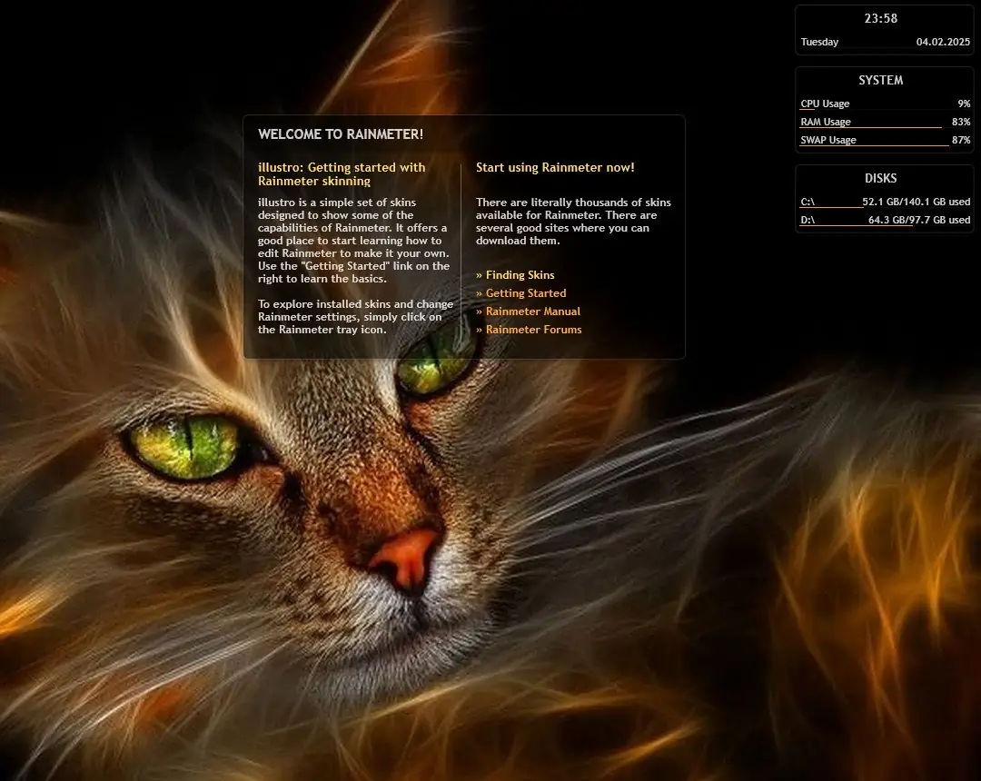 Rainmeter — это программа для персонализации рабочего стола в среде Windows, позволяющая отображать информацию о системе в виде стильных и функциональных виджетов. Она поддерживает мониторинг производительности, настройку внешнего вида интерфейса и интеграцию с внешними сервисами, такими как погода и новости. Информационные элементы органично вписываются в фон, создавая ощущение единого целого с оформлением рабочего стола. Благодаря гибкой системе настройки и обширному сообществу, каждый пользователь может подобрать или создать уникальные скины под свои нужды. Программа работает в фоне, не нагружая систему, и поддерживает как стандартные, так и портативные установки. Утилита подойдёт как для повседневного использования, так и для демонстрации технических возможностей компьютера.