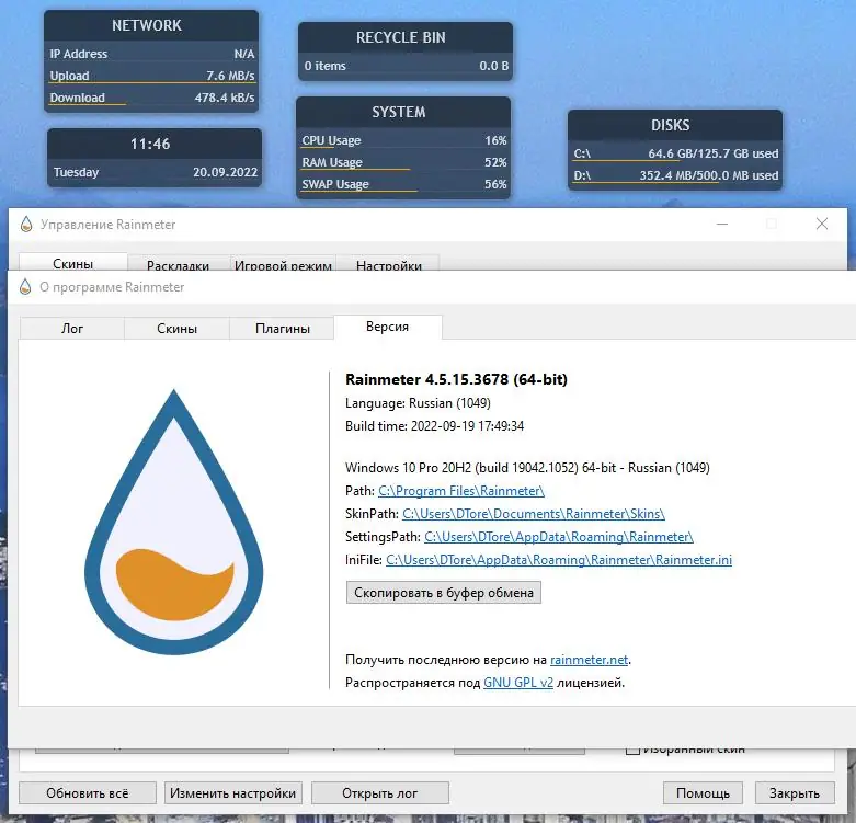После установки Rainmeter автоматически запускается с системой и отображает базовые скины, если они были выбраны. Пользователь может добавлять новые модули через контекстное меню программы, устанавливать сторонние темы или создавать собственные. Каждый элемент настраивается отдельно: можно изменить цвет, размер, положение, источник данных и поведение при наведении. Поддержка языка Lua позволяет расширять функционал через скрипты. Для быстрого доступа к настройкам предусмотрен центральный интерфейс, где отображаются активные скины и их параметры.