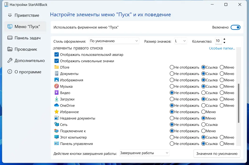 - Гибкие настройки внешнего вида и поведения кнопки «Пуск» и контекстного меню.