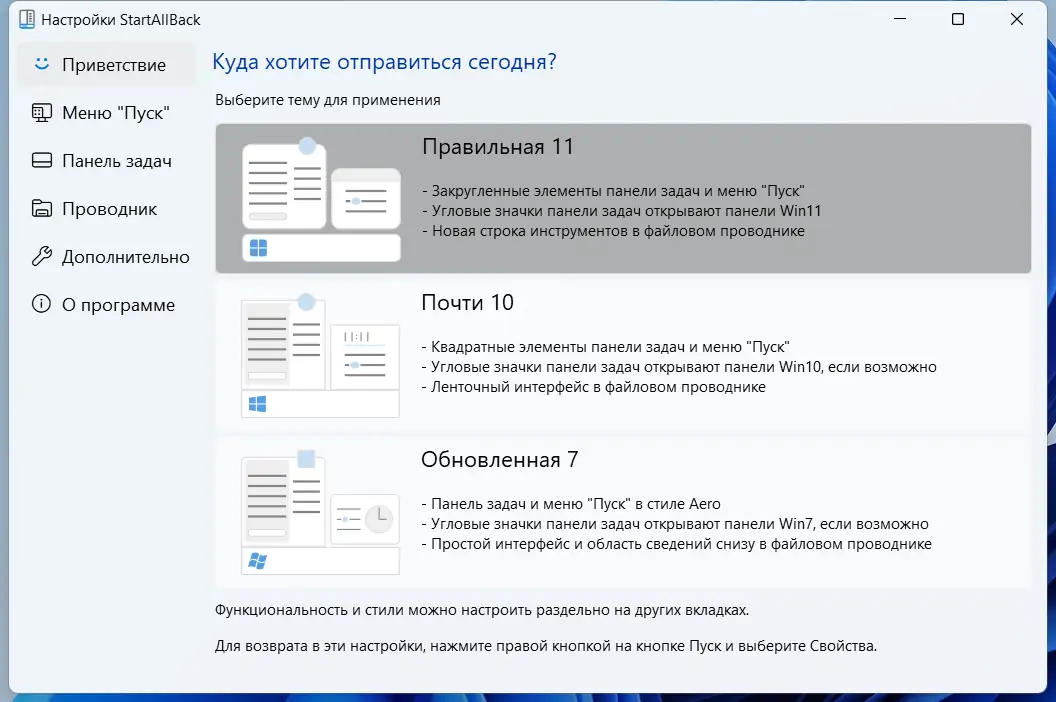 После установки StartAllBack автоматически применяет настройки, соответствующие выбранной версии операционной системы. Пользователь может открыть настройки программы через контекстное меню кнопки «Пуск» и выбрать нужный режим отображения — классический, как в windows 7, или модифицированный под windows 11. Доступны параметры расположения панели, прозрачности, поведения при наведении, а также возможность отключения элементов Metro-интерфейса. Для windows 10 предусмотрена отдельная ветка настроек, учитывающая особенности этой версии. Программа также позволяет задать поведение экрана при входе — например, всегда показывать рабочий стол, минуя стартовый экран.