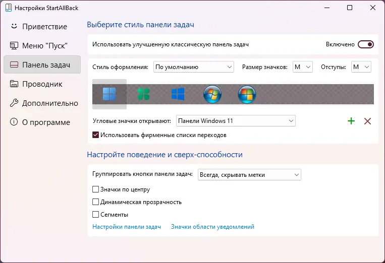 - Возможность настройки внешнего вида кнопки «Пуск», включая скины и собственные изображения.