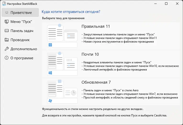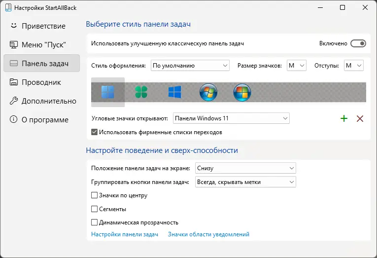 - StartAllBack поддерживает гибкие настройки отображения: можно изменить скины, внешний вид кнопки «Пуск», поведение меню и активные зоны экрана.