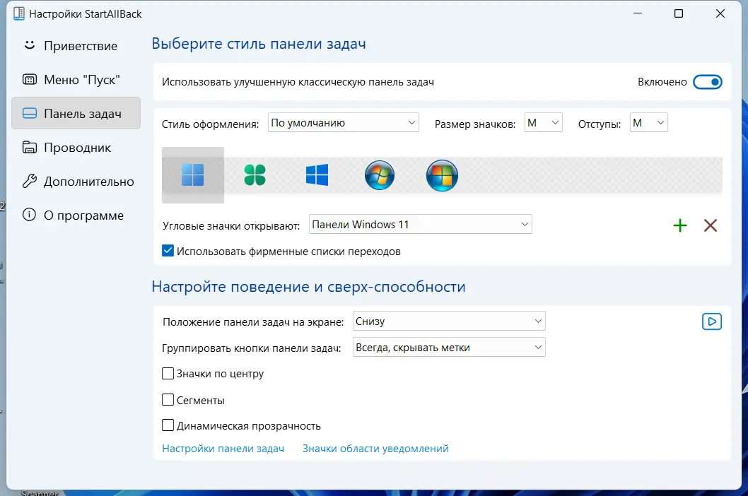 - Поддерживается тонкая настройка: выбор скинов, изображения кнопки «Пуск», активные углы экрана и другие параметры внешнего вида.