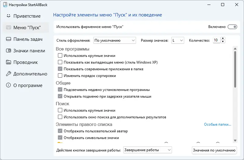 После установки программа автоматически применяет настройки, соответствующие версии операционной системы. Пользователь может открыть панель конфигурации через контекстное меню кнопки «Пуск» или через центр управления утилитой. Здесь доступны параметры отображения меню, поведения кнопки, анимации, а также разделение приложений по типу. Можно настроить, чтобы в меню отображались только классические программы, а приложения из магазина показывались отдельно. Поддерживается редактирование горячих клавиш, включая восстановление функциональности Copilot. В версии 3.9 были устранены ошибки с анимацией выпадающих списков и адаптировано поведение интерфейса в зависимости от типа системы.