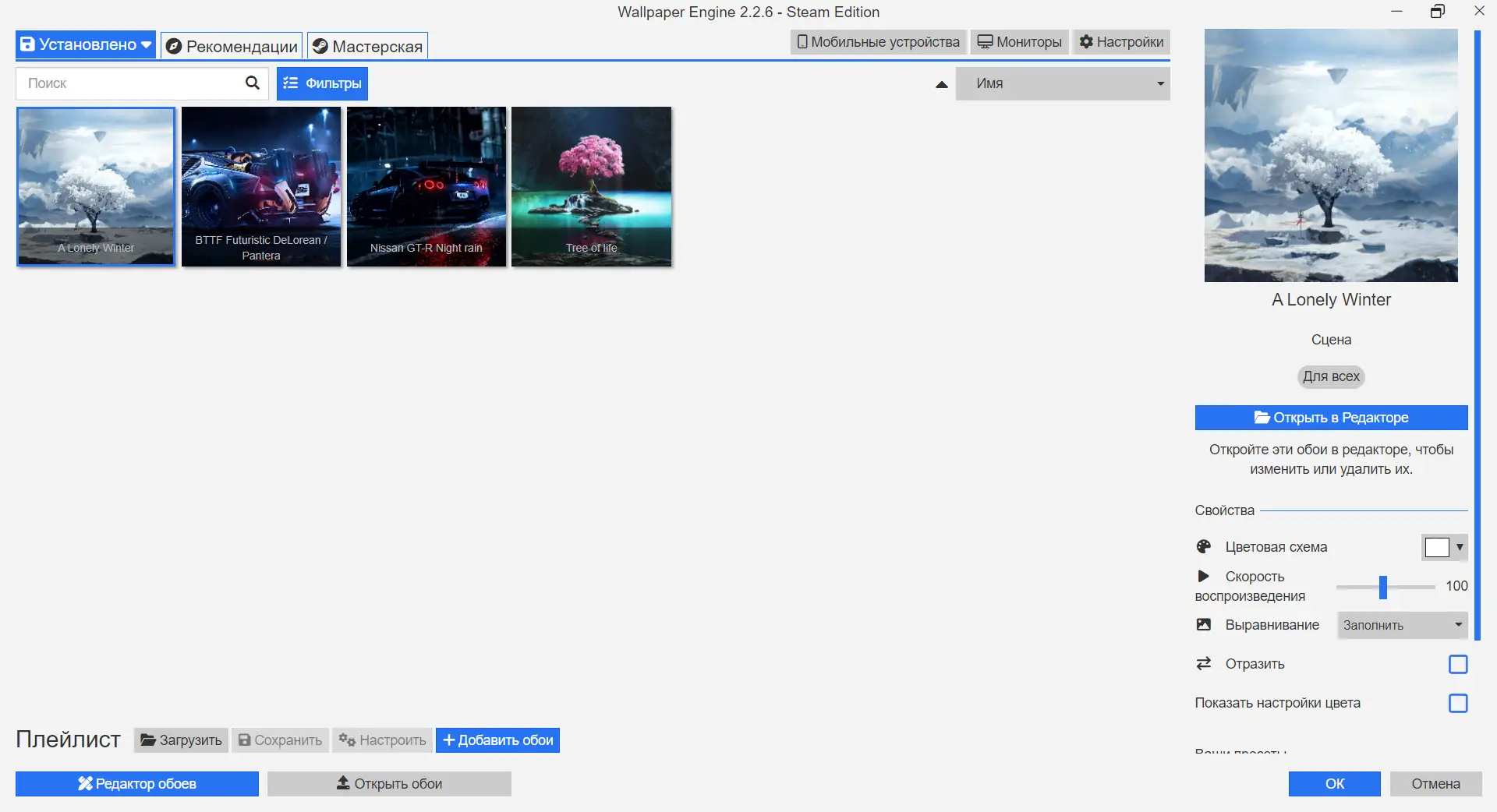 После установки приложение запускается через ярлык или через Steam. В главном окне отображается библиотека обоев, включая установленные локально и загруженные из мастерской. Пользователь может выбрать понравившееся изображение, кликнуть по нему и применить одним щелчком. Для создания собственных проектов используется встроенный редактор, поддерживающий импорт медиафайлов, настройку анимации и параметров отображения. Также можно настроить поведение обоев в зависимости от времени суток, температуры или музыкального трека. Программа поддерживает множество видеоформатов, включая mp4, WebM, avi, mov и другие, что расширяет возможности выбора контента.