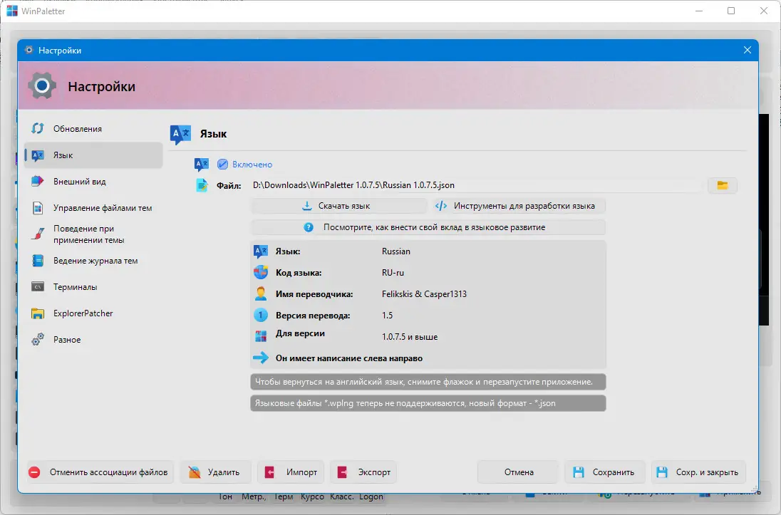 Запуск приложения не требует инсталляции — достаточно открыть исполняемый файл. В главном окне доступны вкладки для настройки цветов, стилей интерфейса и параметров входа. Пользователь выбирает нужные оттенки с помощью палитры, не вводя RGB-значения вручную. После внесения изменений можно нажать Refresh для просмотра результата в реальном времени. Окончательное применение настроек происходит после нажатия кнопки Apply, что инициирует перезапуск проводника. Для добавления русского языка необходимо в настройках активировать опцию перевода и указать путь к языковому файлу в формате JSON.