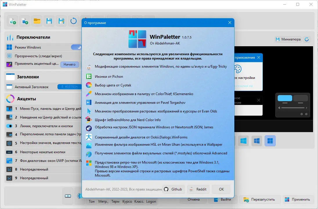 WinPaletter — портативное приложение для тонкой настройки внешнего вида Windows 10 и 11, включая цветовые схемы, экран входа в систему и блокировки. Инструмент позволяет изменять интерфейс без редактирования реестра вручную, поддерживает предварительный просмотр изменений и работу со старыми Win32-приложениями. Программа не требует установки и предоставляет расширенные опции персонализации для пользователей, стремящихся к уникальности в оформлении системы.