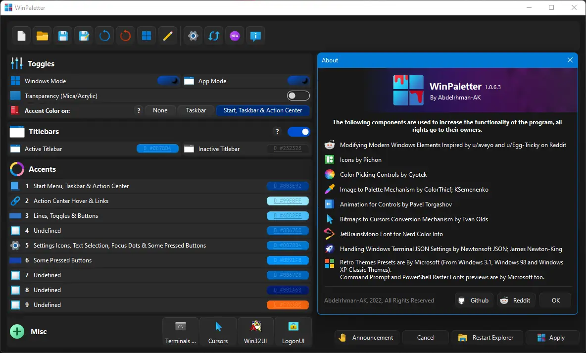 WinPaletter — портативное приложение для тонкой настройки цветовых схем Windows 10 и 11, позволяющее изменять внешний вид интерфейса, экрана входа в систему и блокировки. Программа поддерживает настройку тем для современных и устаревших приложений, включая элементы Win32, и предлагает инструменты для управления фоновыми изображениями, прозрачностью и стилями. Все изменения можно предварительно просмотреть и применить без необходимости перезагрузки системы.