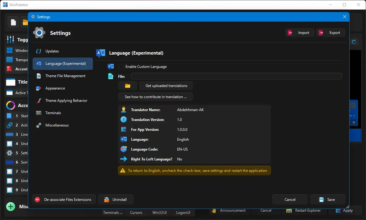 Интерфейс приложения интуитивно понятен и разделён на логические блоки: общие настройки темы, параметры рабочей среды, внешний вид экрана входа и дополнительные опции. Пользователь может выбрать нужный цвет с помощью палитры, не вводя значения RGB вручную, а также загрузить собственное фоновое изображение для LoginUI. После внесения правок изменения можно просмотреть с помощью кнопки Refresh, а окончательное применение выполняется через кнопку Apply, после чего explorer.exe перезапускается. Сохранённые темы можно экспортировать или импортировать на другом устройстве, что удобно для резервного копирования или распространения стилей.