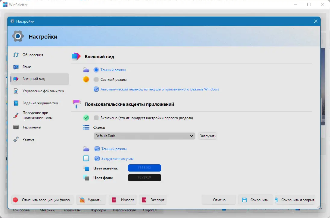 - Сохранение пользовательских тем для быстрого переключения между оформлениями