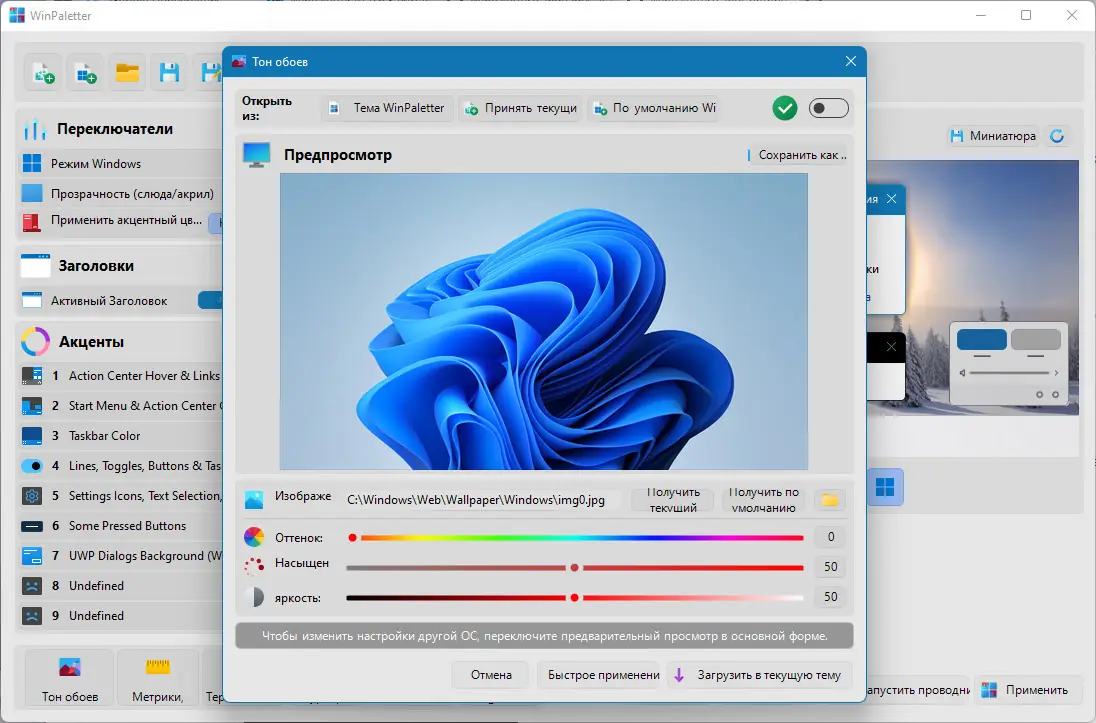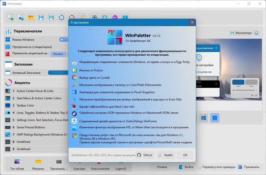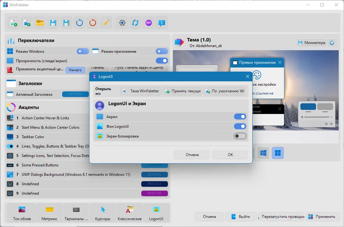 WinPaletter — это инструмент для глубокой персонализации внешнего вида операционной системы Windows 10 и 11, позволяющий изменять цветовые схемы, шрифты, элементы интерфейса и даже оформление экрана входа в систему. Программа поддерживает настройку как современных компонентов оболочки, так и устаревших элементов Win32, обеспечивая единый стиль по всему интерфейсу. Благодаря встроенному предпросмотру, все изменения можно оценить до их применения.