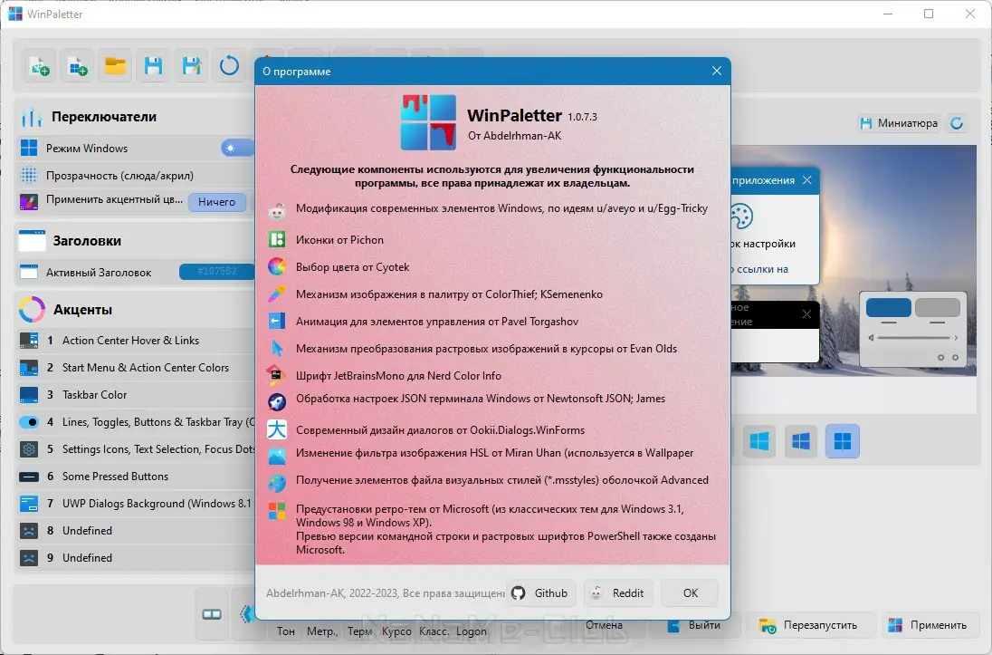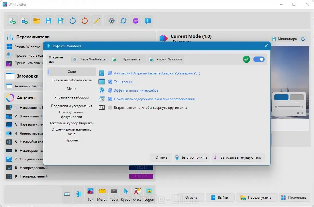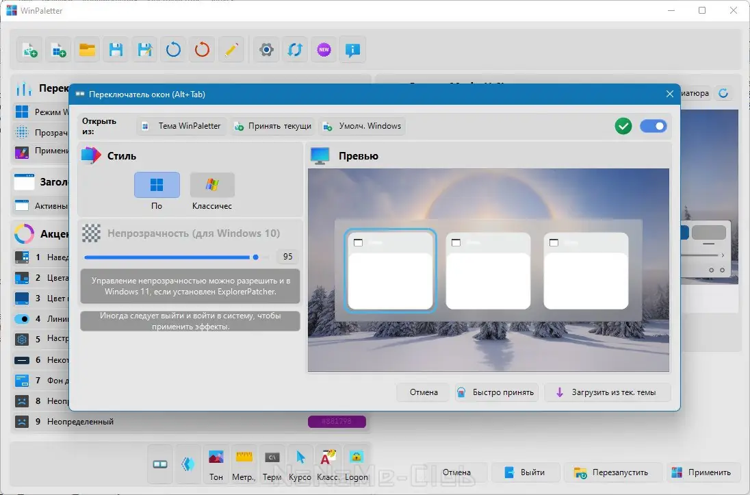 WinPaletter — это автономное приложение, предназначенное для глубокой кастомизации интерфейса Windows. Оно позволяет не только менять цветовую палитру системы, но и настраивать поведение панели задач, меню «Пуск», проводника, а также внешний вид экрана входа и блокировки. Программа не требует установки и работает напрямую с системными параметрами, обеспечивая стабильное применение изменений.