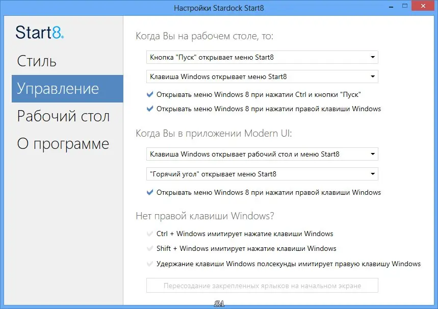 - Делает стартовый экран Windows 8 доступным прямо из меню «Пуск»