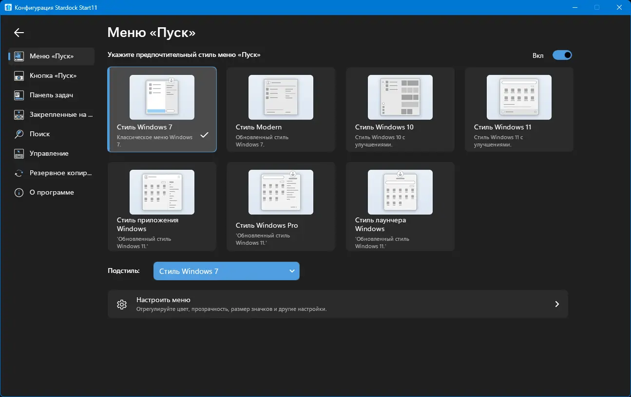 - Поддержка различных стилей меню: классический вид Windows 7, современный интерфейс Windows 10 и адаптация под Windows 11