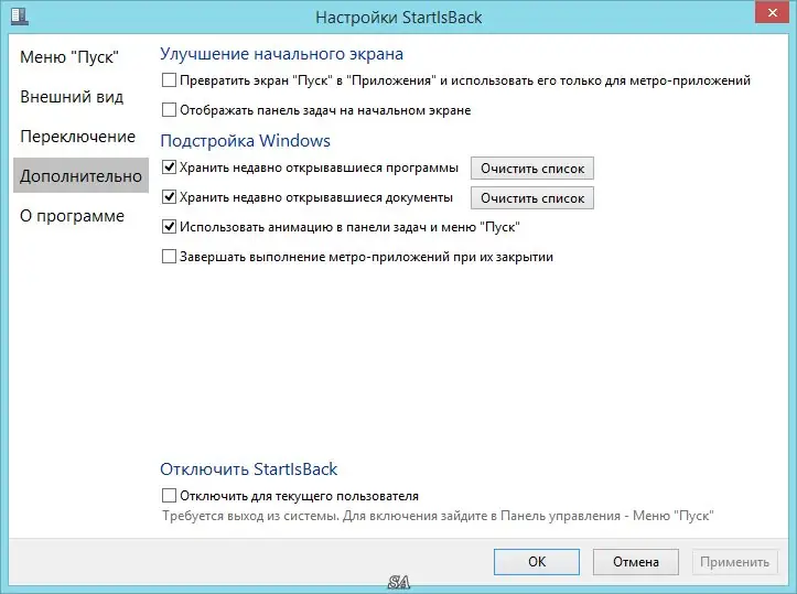 - Полностью восстанавливает классическое меню Пуск с поддержкой поиска, ярлыков и недавно запущенных приложений.