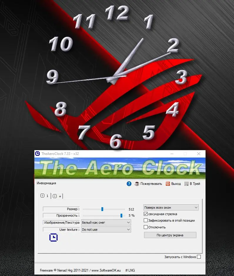 TheAeroClock — это стильные настольные часы с эффектом прозрачности, которые отображаются прямо на рабочем столе. Программа сочетает в себе функциональность и эстетику, позволяя следить за временем без перегрузки интерфейса. Лёгкая в использовании и не нагружающая систему, она подойдёт тем, кто ценит минимализм и удобство.