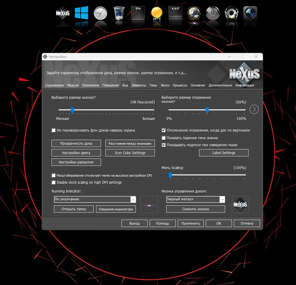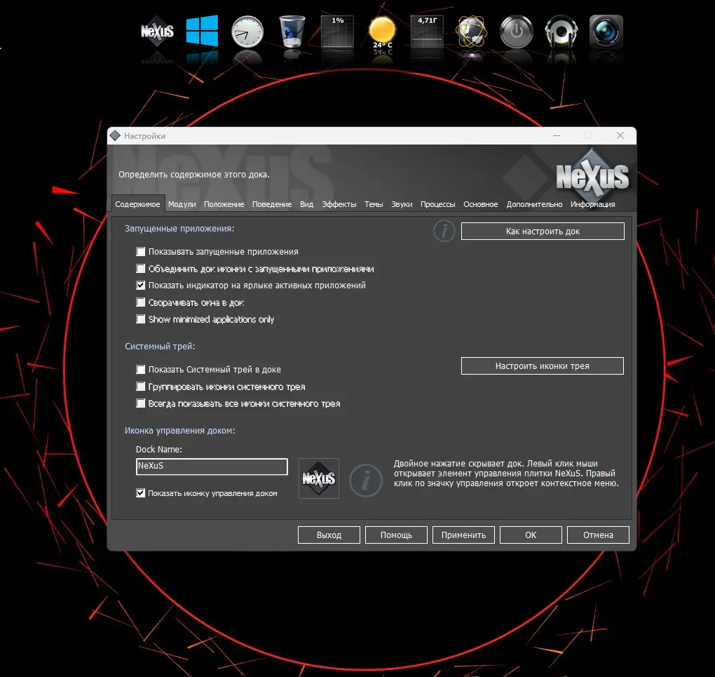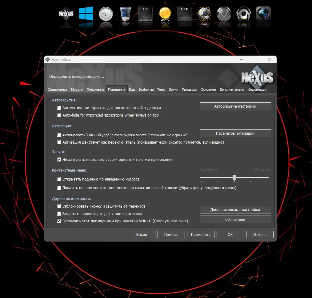 - Полная настройка поведения dock, включая прозрачность, позиционирование и реакцию на события.