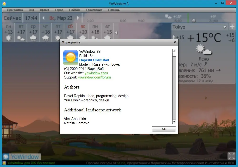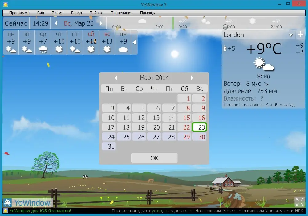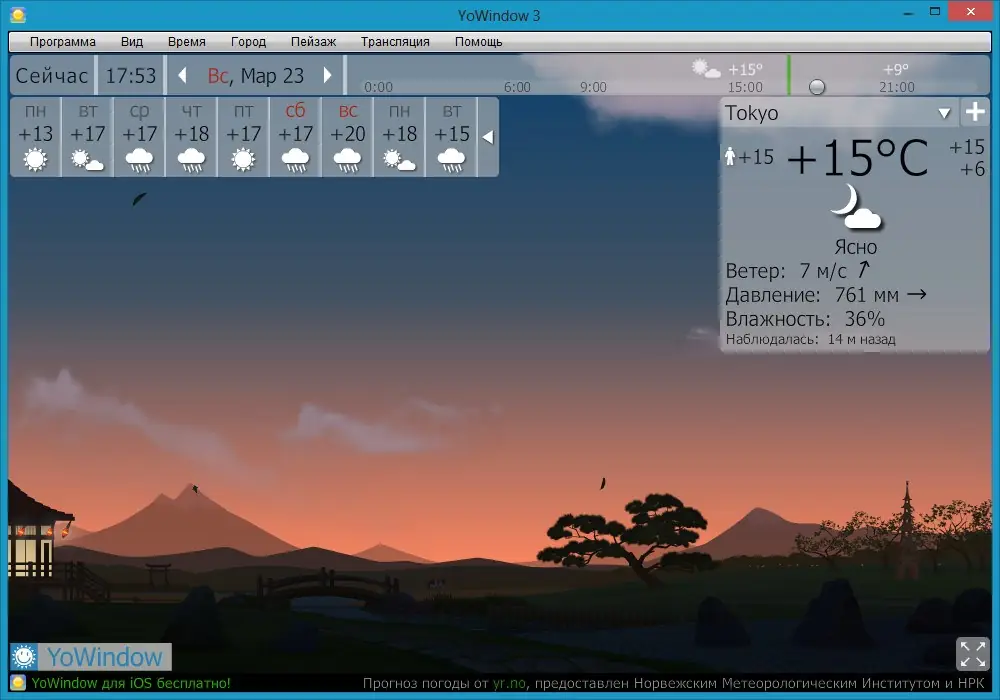 YoWindow — это живая модель окна, демонстрирующая реальную погоду в вашем регионе с высокой детализацией. Программа визуализирует пейзаж, который меняется в зависимости от времени суток, сезона и текущих метеоусловий. От дождя и снега до восхода солнца и фаз луны — всё отображается в реальном времени или с возможностью просмотра прогноза на будущее.
