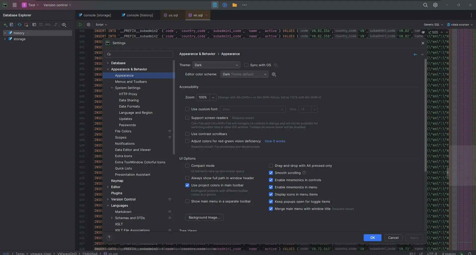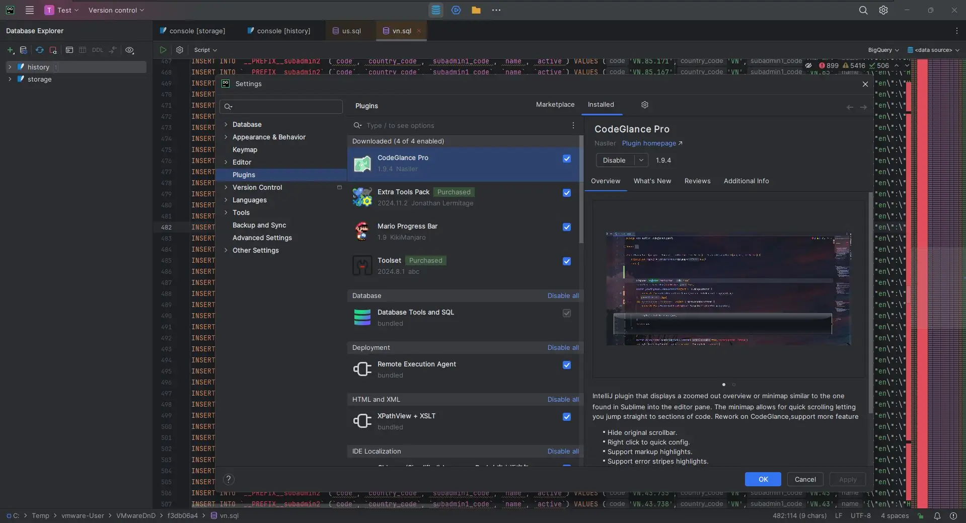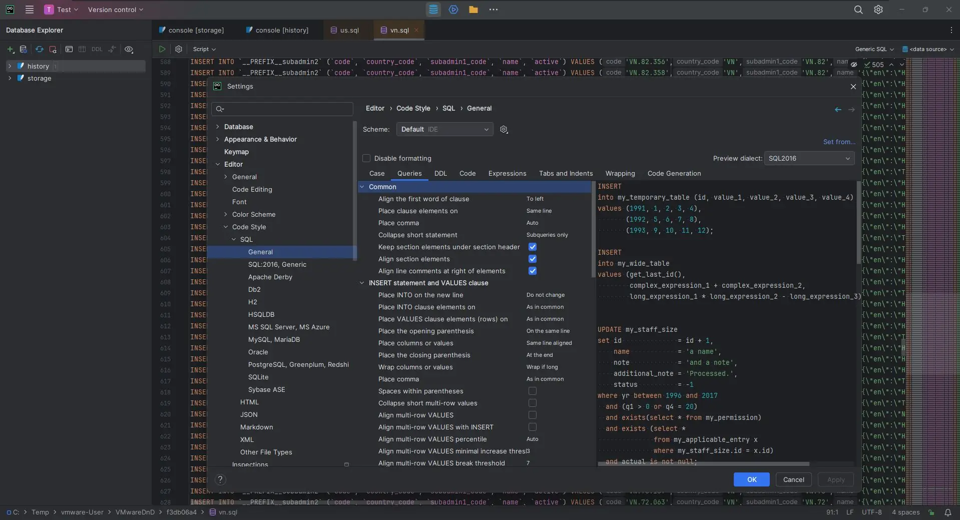 Работа в DataGrip начинается с настройки подключения к базе данных, где пользователь указывает параметры хоста, порт, логин, пароль и используемый драйвер. После подключения среда автоматически сканирует схему и отображает все таблицы, представления, индексы и хранимые процедуры в древовидной структуре. Редактор SQL поддерживает мультикурсорный ввод, форматирование по стилю, быстрое рефакторинговое переименование и навигацию по объектам. При выполнении запросов результаты отображаются в табличной форме, где их можно фильтровать, сортировать и редактировать напрямую. Консоль запросов позволяет сохранять историю выполненных операций, а локальная история защищает от потери изменений. Для визуализации связей между таблицами используется встроенный построитель диаграмм, который отображает внешние ключи и зависимости. Также доступны средства сравнения данных и схем, импорт из CSV с настройкой сопоставления столбцов, а также экспорт в JSON, XML, HTML или как SQL-запросы INSERT/UPDATE. Поддержка пользовательских шаблонов параметров и регулярных выражений расширяет возможности автоматизации рутинных задач.