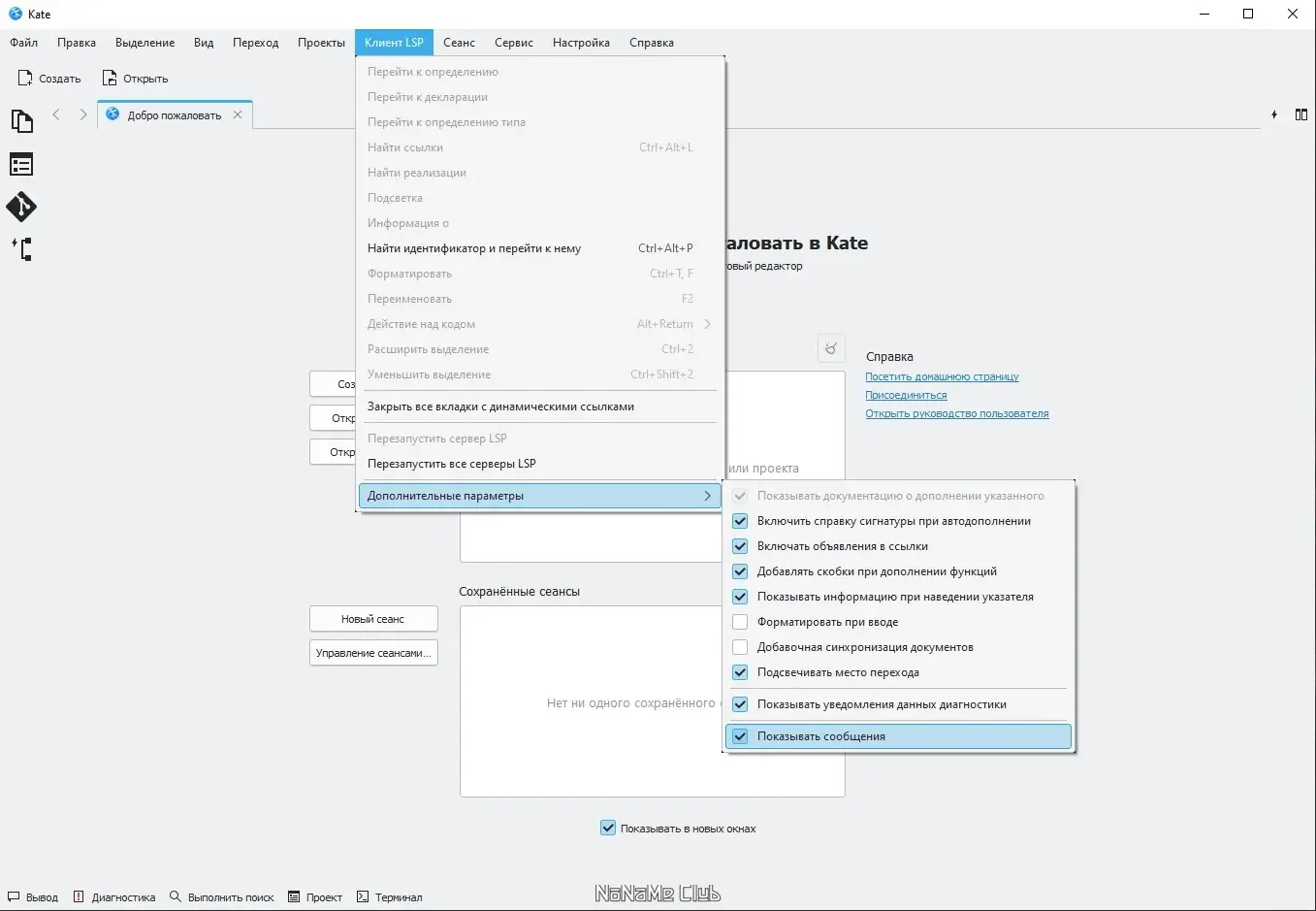 Kate — это часть экосистемы KDE, ориентированная на создание удобной среды для написания кода, разметки и текстов. Программа поддерживает работу с Unicode, корректно отображает текст в разных направлениях и автоматически определяет форматы окончания строк, что особенно важно при совместной работе в гетерогенных системах. Встроенные функции, такие как сворачивание кода, нумерация строк, индикаторы изменений и отметки на полосе прокрутки, делают навигацию по большим файлам интуитивной и быстрой.