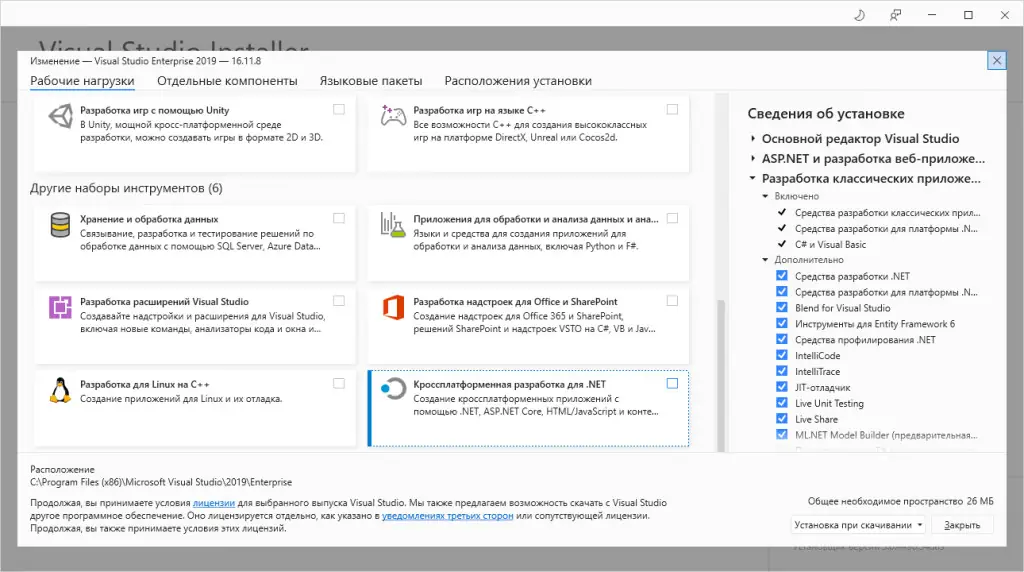 - Возможность скачать расширенные компоненты, включая пакеты redistributable для различных сред выполнения.