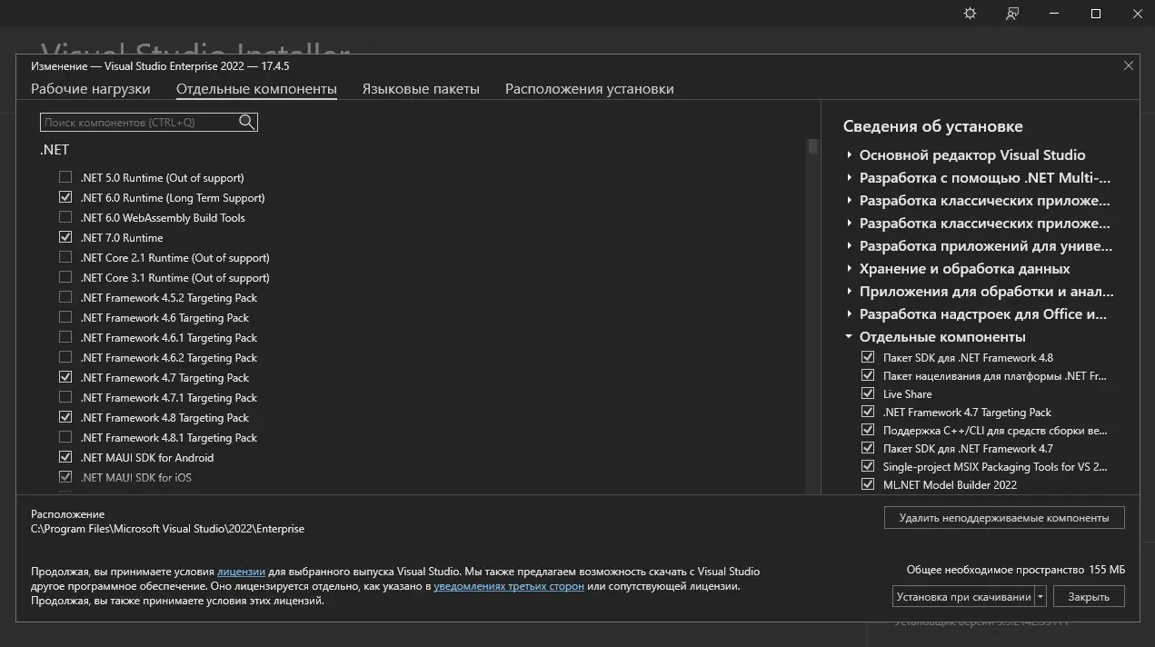 - Поддержка широкого спектра языков, включая C, C++, C#, и возможность скачать дополнительные компоненты через установщик.