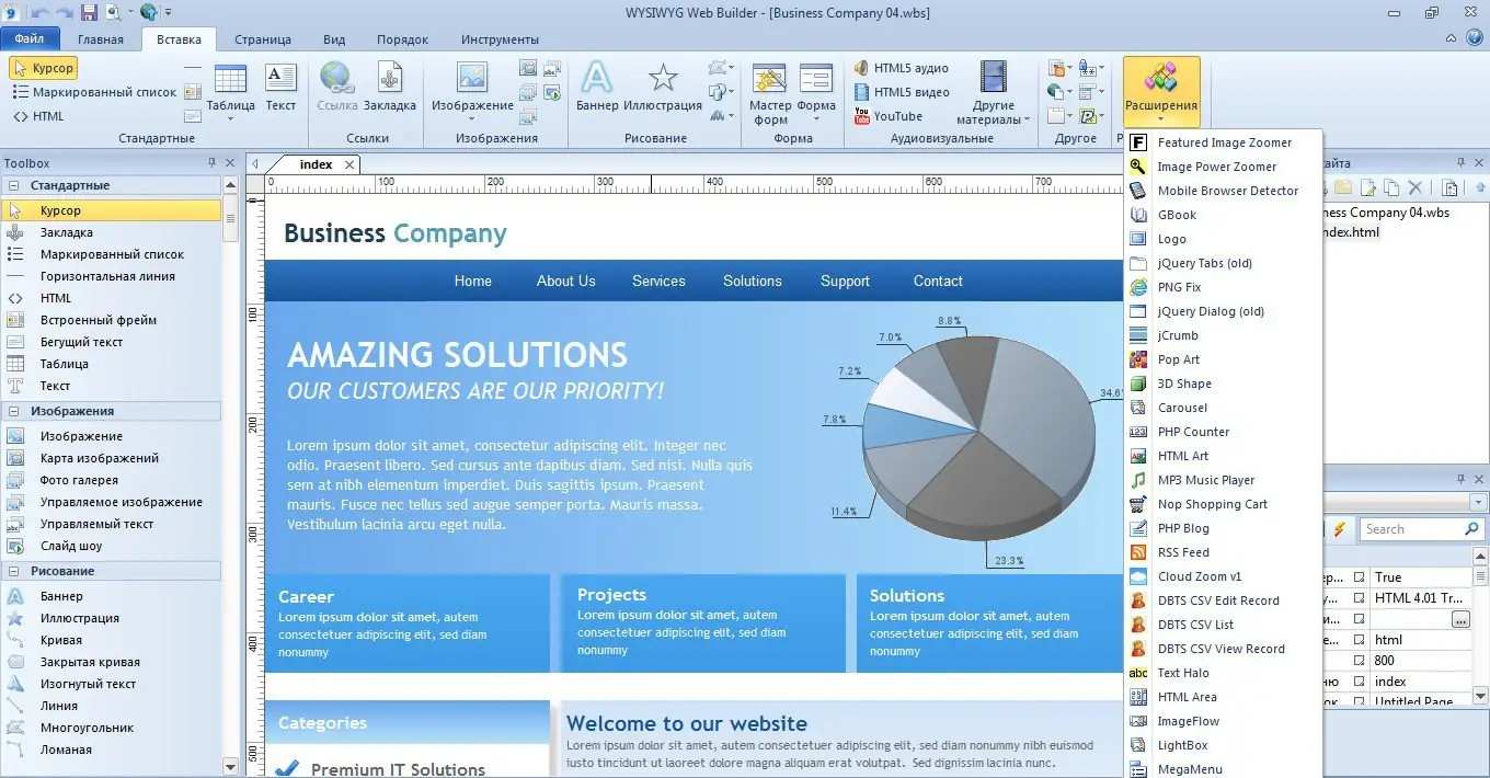 WYSIWYG Web Builder представляет собой инструмент для визуальной разработки веб-страниц, где каждый элемент размещается на рабочей области методом drag-and-drop. Вся генерация HTML, CSS и других компонентов происходит автоматически, что позволяет сосредоточиться на дизайне и структуре контента, не углубляясь в технические детали. Программа поддерживает широкий спектр мультимедийных вставок, интерактивных элементов и адаптивных решений.