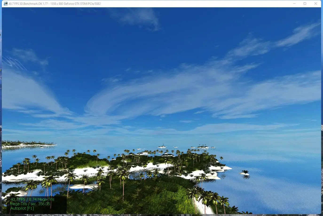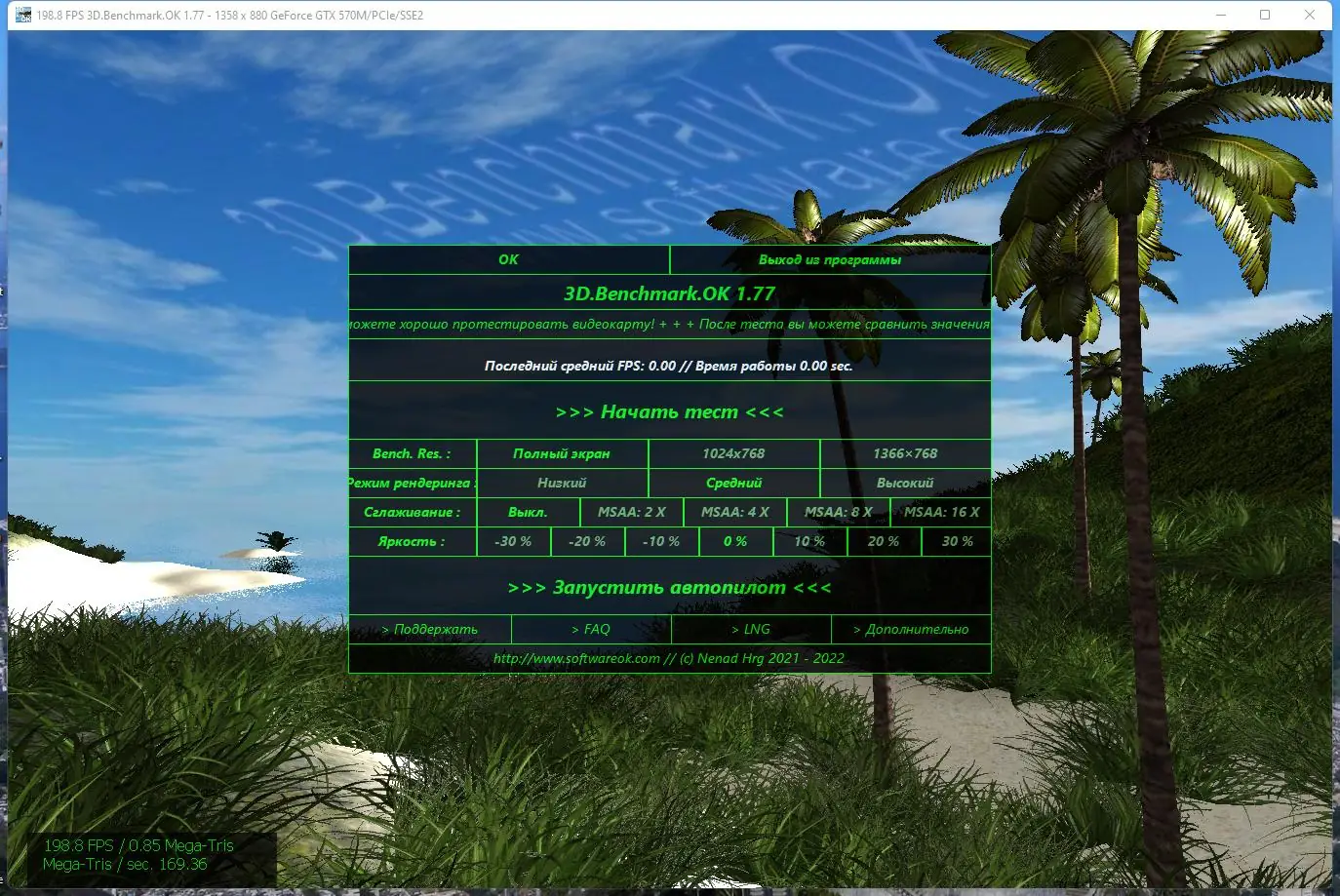 3D.Benchmark.OK представляет собой специализированный инструмент для измерения возможностей графического адаптера в условиях, близких к реальным. Программа загружает видеокарту сложными визуальными эффектами, такими как преломление света, отражения, симуляция воды и динамическое освещение, чтобы максимально точно оценить её производительность. Тест длится всего 65 секунд, что делает его одним из самых быстрых в своём классе.