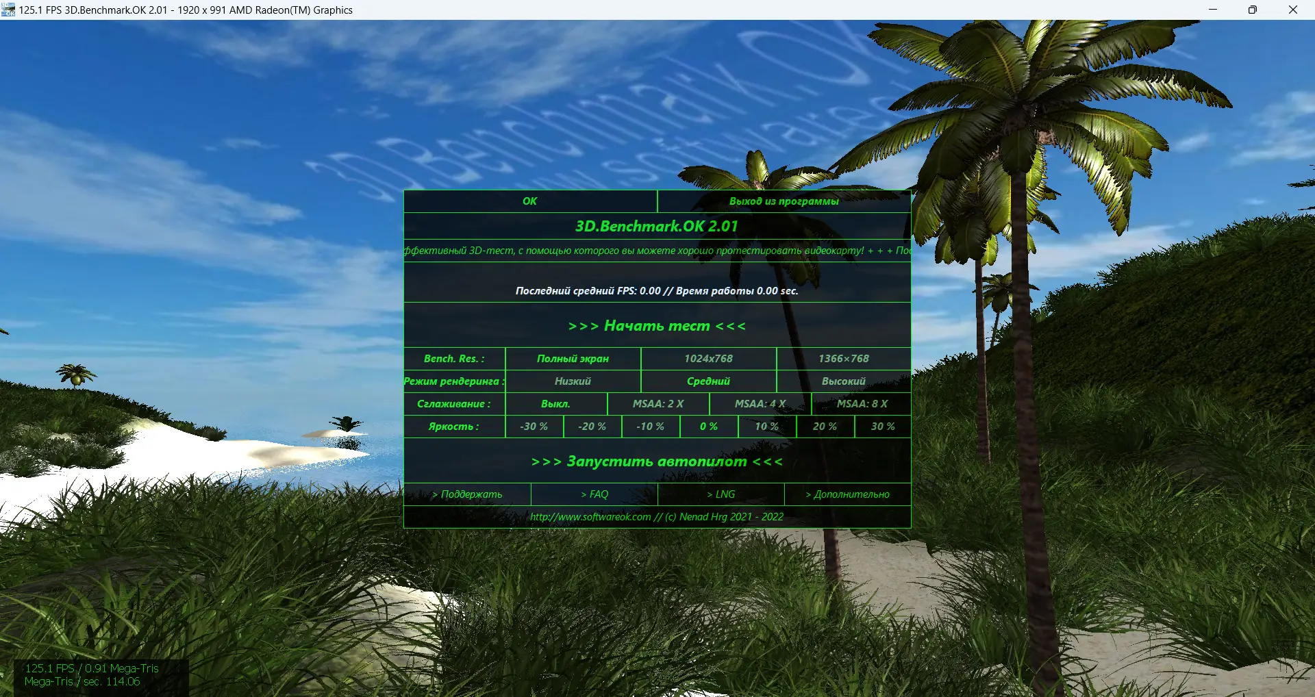 3D Benchmark OK — это компактная утилита для тестирования производительности видеокарты в 3D-сцене, позволяющая за минуту получить точные данные о графической мощности системы. Программа подходит как для новичков, так и для опытных пользователей, желающих проверить стабильность системы после обновления драйверов или замены оборудования. Благодаря встроенной демонстрации автопилота и возможности сравнения результатов онлайн, приложение становится незаменимым инструментом диагностики.