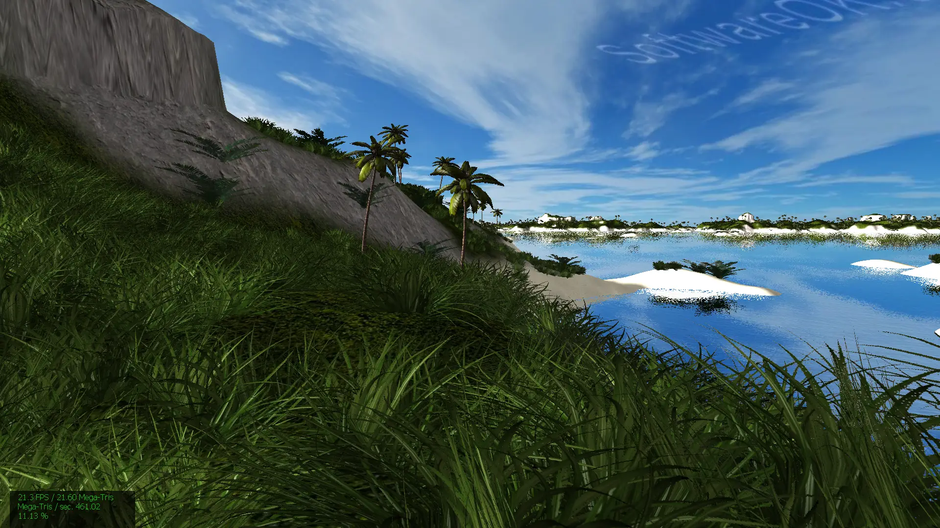 - Сцена теста включает динамические эффекты: ветер, воду, преломление света и зеркальные отражения.