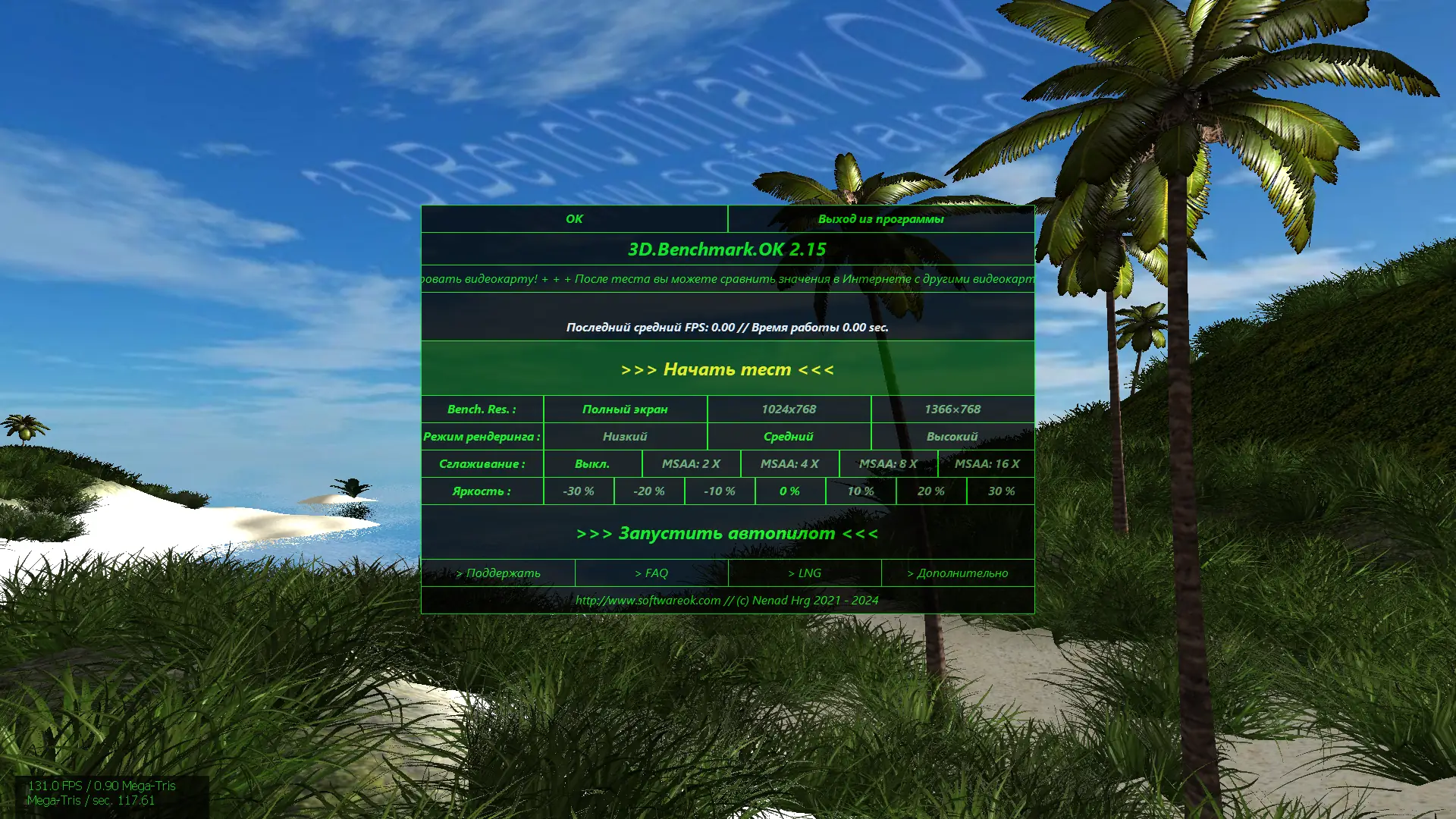 - Программа автоматически определяет параметры видеокарты и настраивает тест под текущее оборудование.